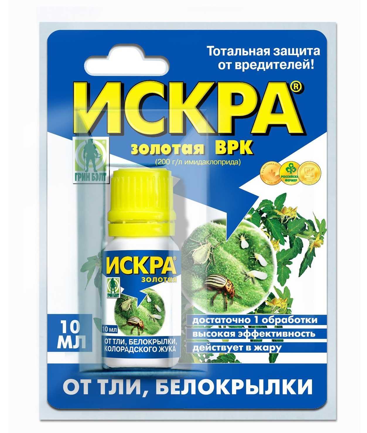 Также он быстро устраняет вредителей на грядках и ваших посадках. Вещество оказывает на них нервно-паралитическое действие, когда «Искра золотая» попадает внутрь с пищей. Отравление паразитов начинается уже в первые часы воздействия, поэтому часто хватает одной обработки, чтобы избавить урожай от нашествия насекомых.