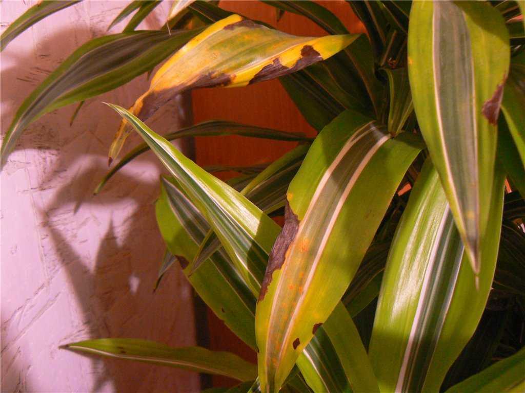 Желтеют листья у драцены и от попадания прямых солнечных лучей. Если ваш цветок стоит на месте, куда постоянно светит солнце, его верхние листья начинают желтеть и опадать. Они могут получить не только ожог, но и просто высохнуть от перегрева.