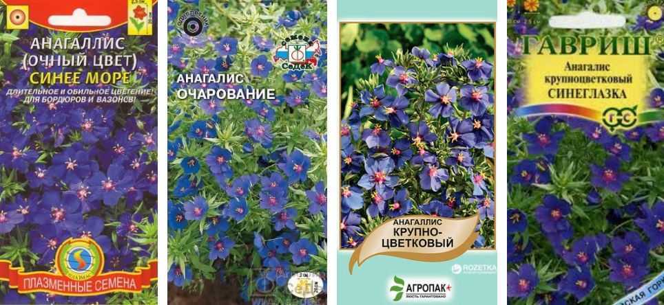В нашей стране в продаже встречается чаще всего именно крупноцветковый анагаллис с цветками различных оттенков синего. Сорта «Очарование» (Седек), «Синеглазка» (Гавриш), «Синее море» (Плазменные семена), «Крупноцветковый» (Агропак) стоят недорого и легко доступны.