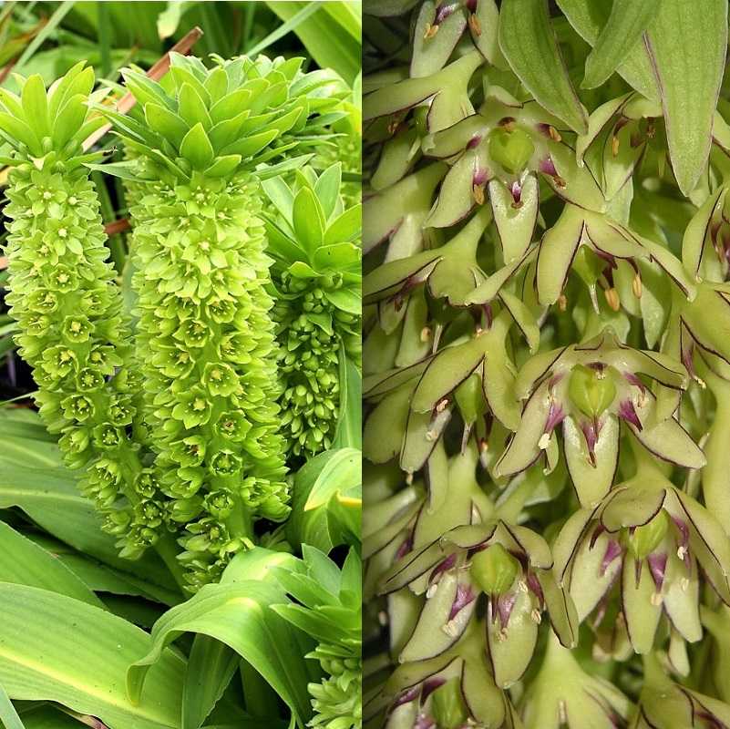 Из середины луковицы в начале лета образуется мощный цилиндрический цветонос — стрелка. Это очень упругий стебель, достигающий максимально 1 метра в высоту. На нем образуются небольшие цветки, похожие на звездочки, собранные в густые кистевидные соцветия длиной до 30 см. Бутоны могут иметь белый или кремовый оттенок с зеленым, пурпурным или лиловым отливом. Существуют виды и гибриды, имеющие несколько оттенков, например, Биколор. Околоцветники разделены на 6 частей, срастающихся к основанию, они не отпадают во время отцветания. В верхушке соцветия образуется «шапка» из зеленых прицветников, их часто можно спутать с листьями. Именно они делают ананасную лилию похожей на экзотический фрукт, что можно заметить на фото ниже. У большинства видов цветения приходится на теплое время года — начало июня-конец июля, существуют и представители, способные сохранять декоративность до сентября.