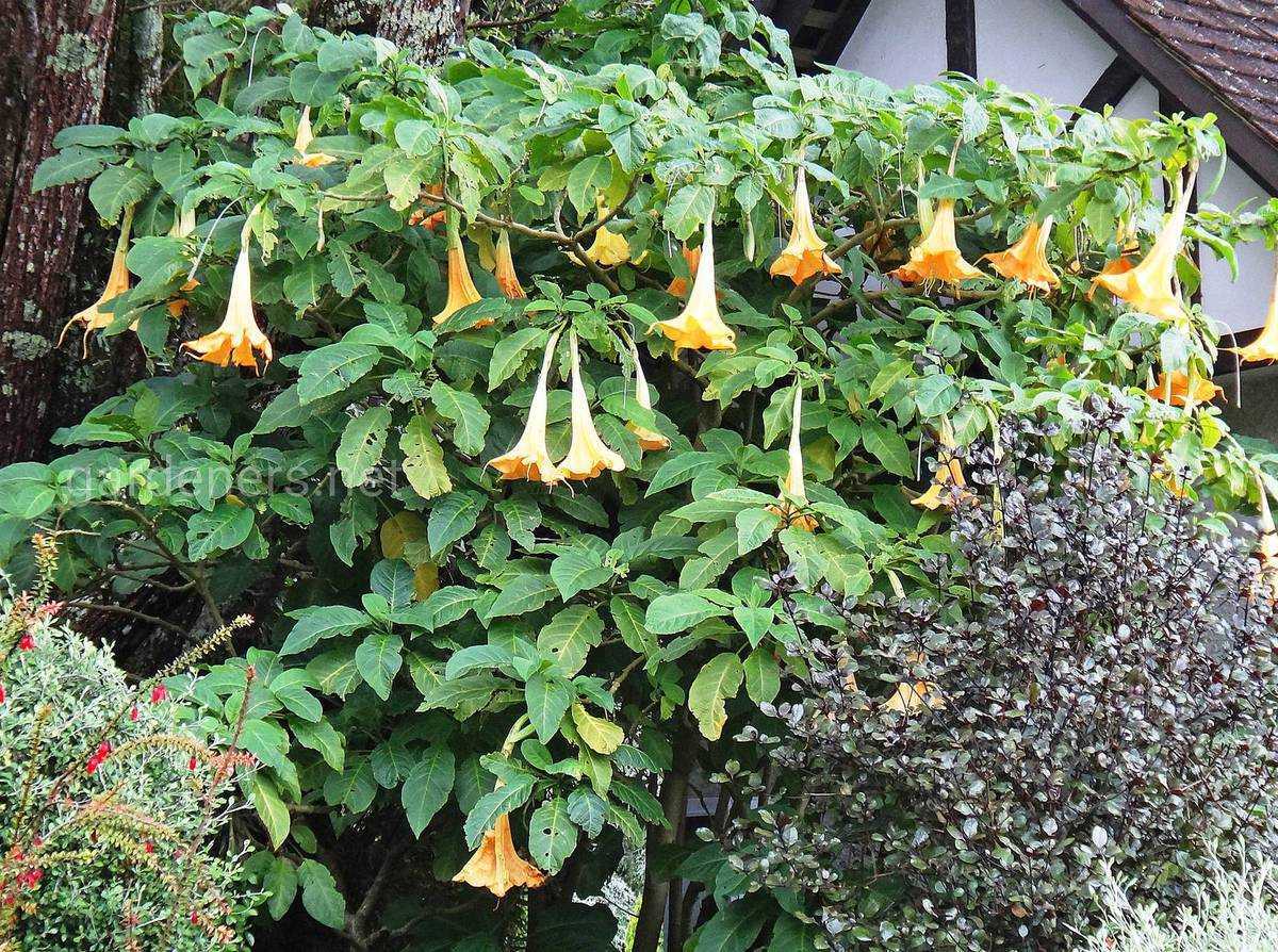 - Золотистая бругмансия, пришедшая к нам из Колумбии. Это древовидный кустарник, высота которого может варьироваться от 2 до 4 м. Он имеет длинные изгибающиеся цветки жёлтого окраса. Иногда могут встречаться разновидности с кремовыми и розовыми цветами. Особенностью золотистой бругмансии является излучение приятного запаха в тёмное время суток. Он привлекает бабочек и многих других насекомых. Листовая пластина тёмного зелёного цвета узкой и удлинённой формы не имеет определённого черешка.