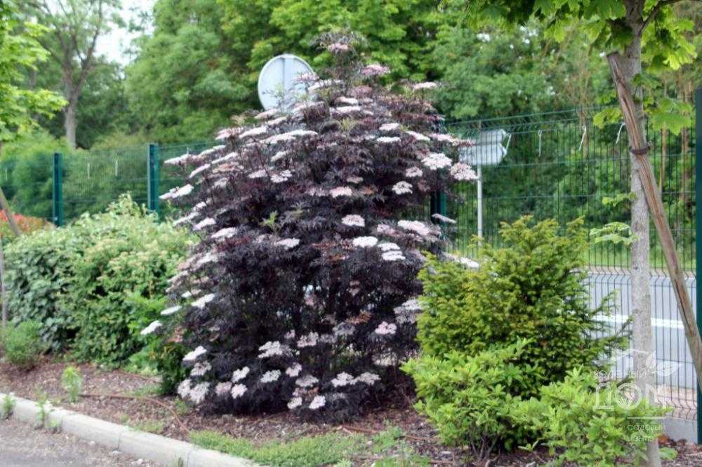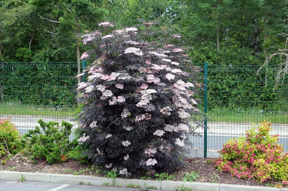 Бузина «Блэк тауэр» или «Черная башня» — медленно растущий столбчатый кустарник 2 м в высоту и 1 м в ширину. Молодые листочки зеленого цвета со временем становятся лилово-фиолетовыми. Идеально подходит для небольших садов. Соцветия розовые.