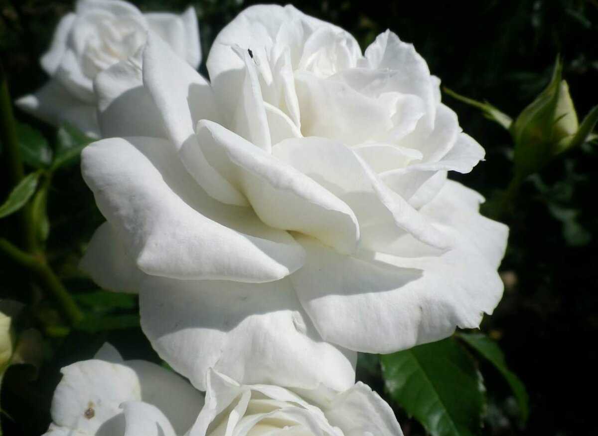 - Frau Karl Druschki. Цветки чашевидной формы, белого оттенка, некоторые лепестки окрашены в розоватую гамму. Относится к растениям, способным цвести до осени, сохраняет бутоны и распустившиеся цветки до наступления холодов.