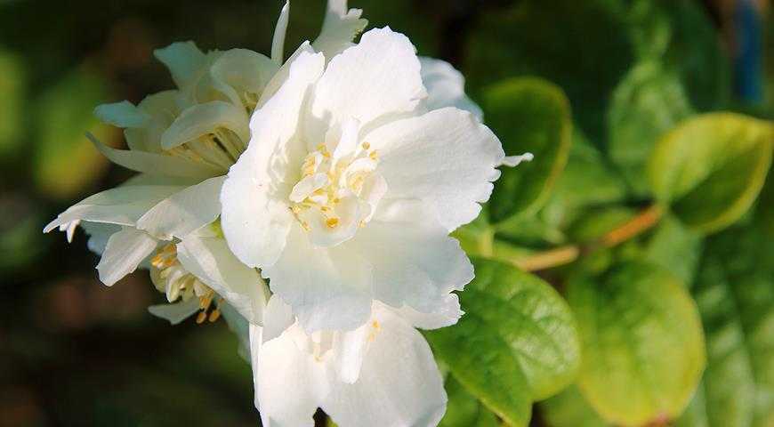 Пёстролистный двухметровый сорт пригодится на затемнённых участках сада — от прямого солнца может выгореть. Что касается цветения, то происходит оно в начале лета и одаряет по-настоящему жасминовым ароматом.