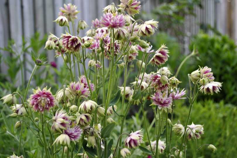 Ухоженные цветочки аквилегии на приусадебном участке.