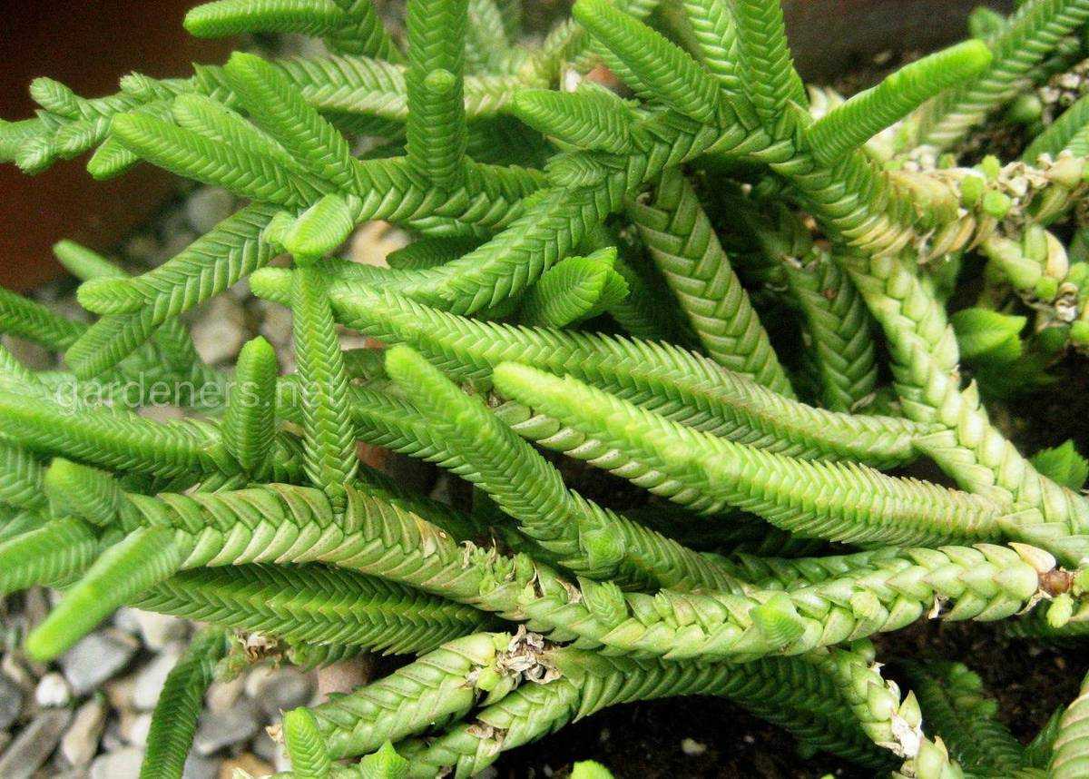 - Крассула кучерявая отличается сильно изогнутыми листьями зеленого цвета.