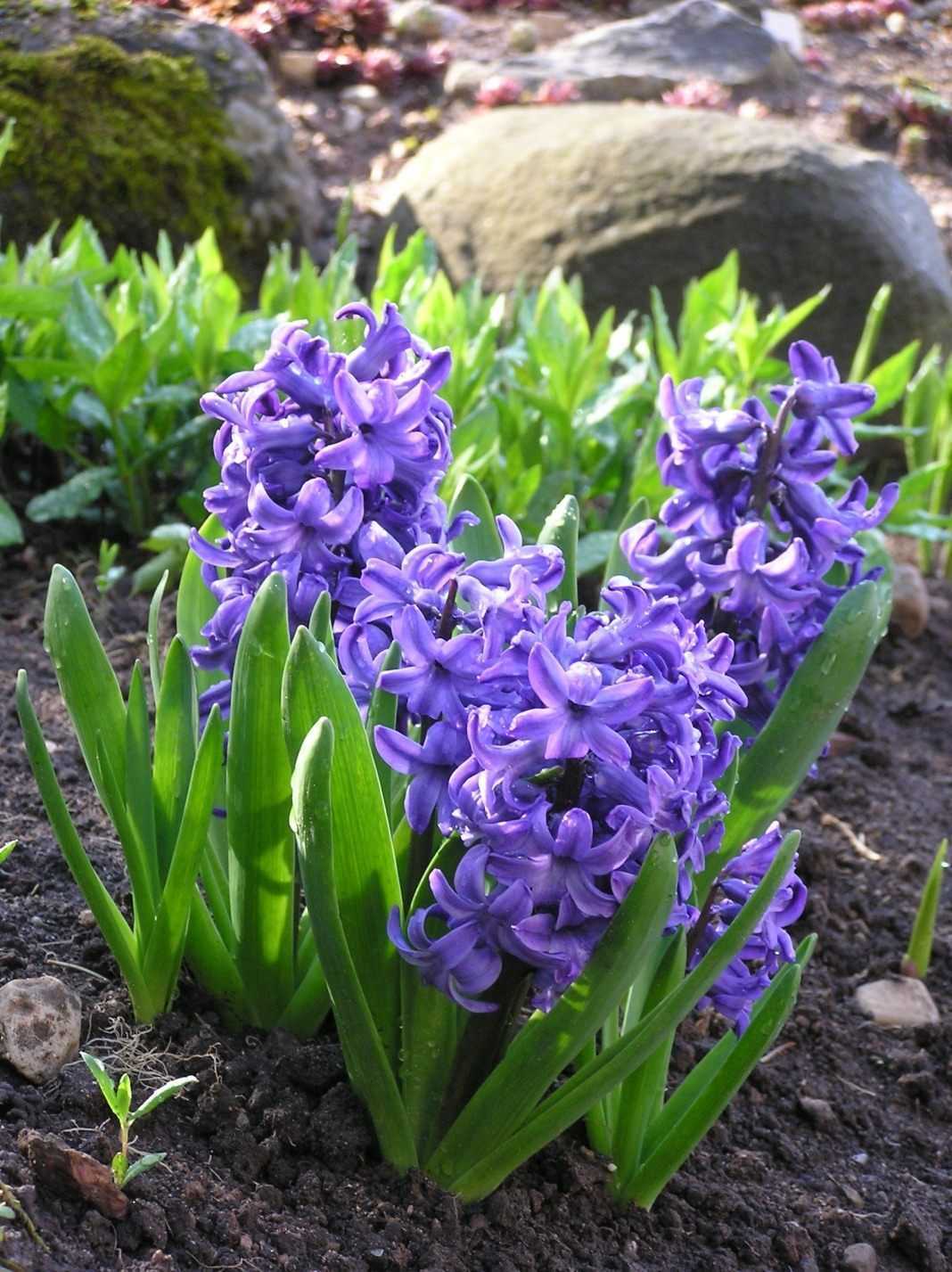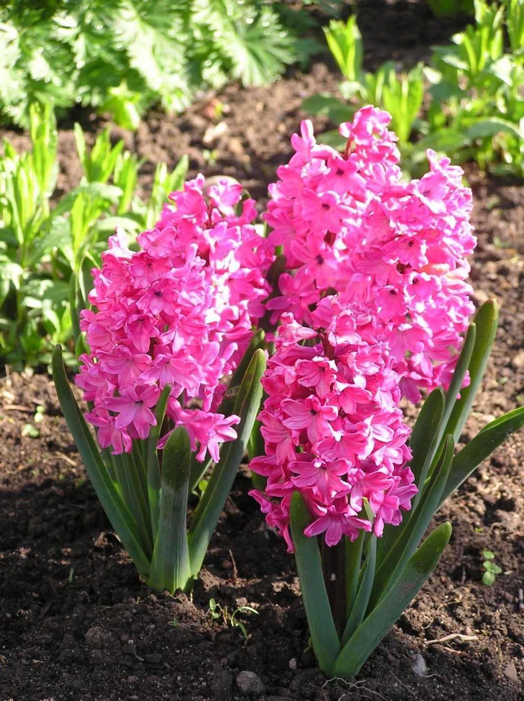 Если гиацинтов много, их высаживают на грядах высотой 15-20 см для предохранения луковиц от талых вод. По весне гряды быстро прогреваются, на них хорошая аэрация верхнего слоя. Кроме того, на гряды легко установить пленочное укрытие. Сажают рядами на расстояние 20-25 см, между соседними луковицами в ряду оставляют не менее 3 диаметров луковицы (для взрослых луковиц —12-15см).