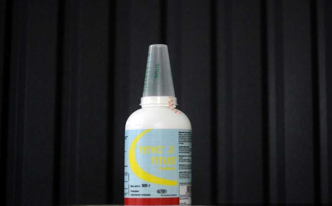 - Титус – гербицид локального действия. Этим веществом можно проводить обработку практически все виды растительных культур. Помимо грибка, оно отлично справляется с сорняками. После того, как было осуществлено опрыскивание, заболевание отступит через пару недель. Одной упаковки препарата хватит, чтобы обработать одну сотку земли. 400 мл средства разводится в 3 л воды.