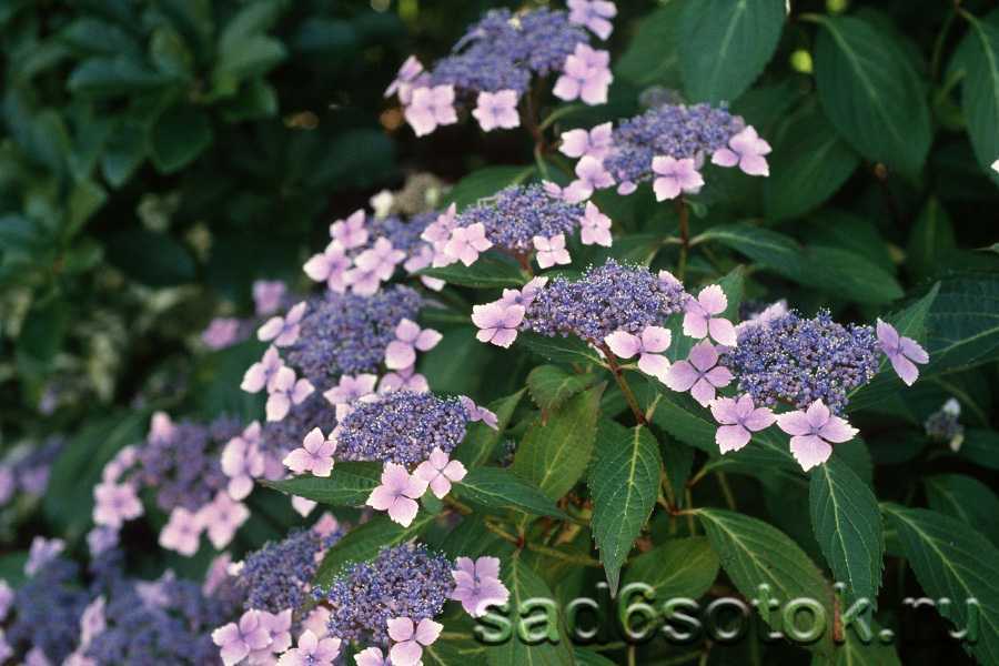 Гортензия пильчатая (Hydrangea serrata) – кустарник с большими, эффектными соцветиями высотой около 1,5 м. Листья эллиптические, на вершине заостренные, до 10 см длиной. Цветки голубые или белые, собраны в щитковидные соцветия, цветет в июле-августе.