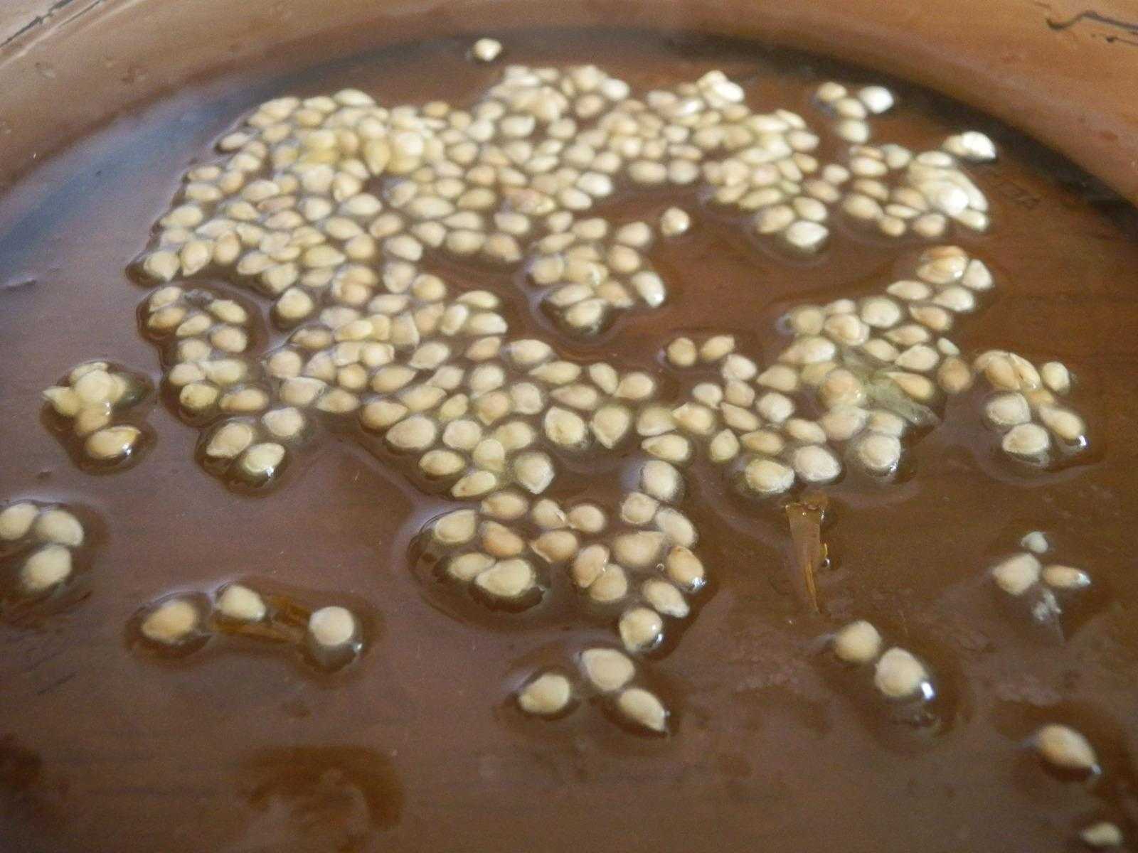 - Разложите сверху семена и держите в теплом месте, периодически увлажняя, и вскоре появятся маленькие белые корни.