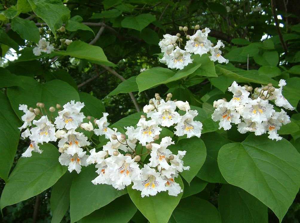 Катальпа великолепная. Дерево с широкой пирамидальной кроной вырастает до 30 м. Оно покрыто широкояйцевидными ярко-зелеными листьями. Длина листовой пластины достигает 30 см, а ширина – 15 см. В начале лета распускаются ароматные кремовые цветы длиной около 7 см. Волнистые лепестки покрыты желтыми полосками и бордово-коричневым крапом.