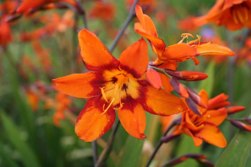 Для оформления летне-осеннего цветника прекрасно подойдет привлекательный, яркий цветок с необычным названием крокосмия многолетняя. Его пышные ярко-оранжевые соцветия эффектно сочетаются с узкой ярко-зеленой листвой. Цветок отличается не только своим выразительным, но и продолжительным цветением, которое длится до самой осени.