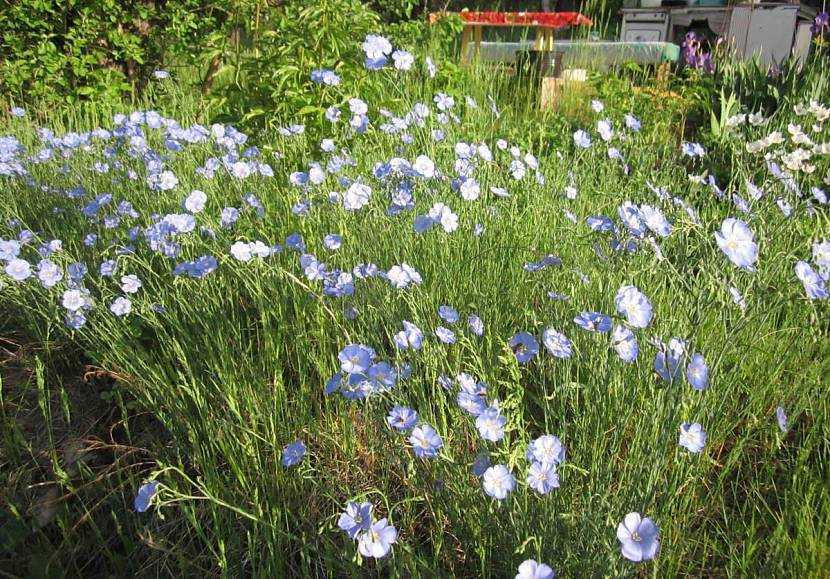 Среди цветоводов большой популярностью пользуется однолетний лен крупноцветковый, а у меня на участке растет лен многолетний. Сортов такого льна достаточно много. Есть среди них лен с красными, синими и даже желтыми цветками. Мне же по душе лен голубой, он очень похож на лен-долгунец, из которого, кстати, делают льняное масло и льняную ткань.