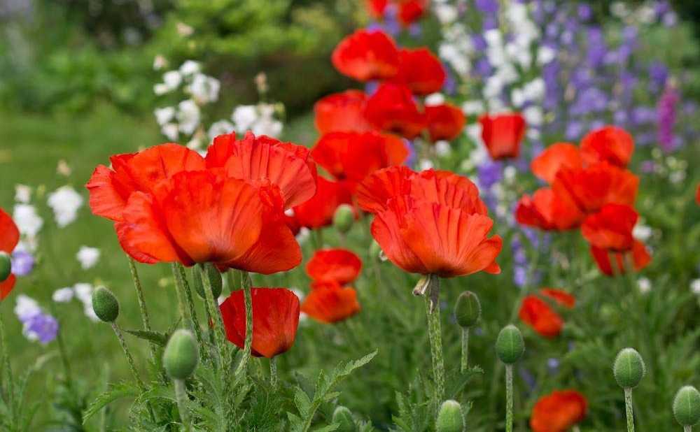 Сочетается мак также с геранью, колокольчиками, ирисами, люпином и многими другими яркими цветами.