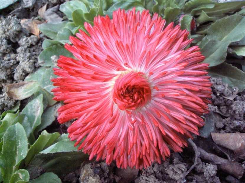 Маргаритка многолетняя позиционируется как двухлетнее растение. Листья имеют удлиненное овальное строение и образуют прикорневую корзинку, которая формируется уже в первый год после высадки. Цветы белого, розового или алого цветов, шириной 3-8 см.