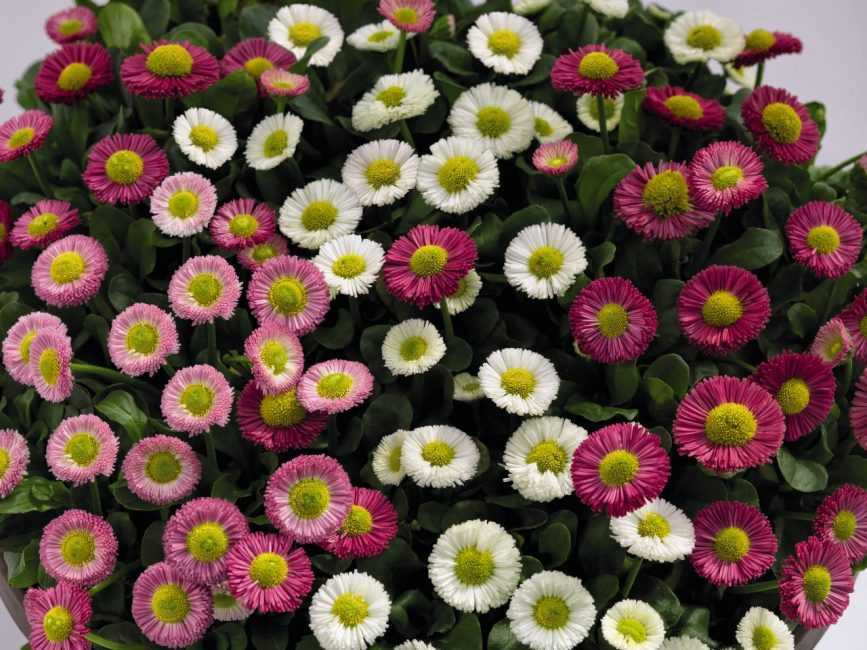 Похожи на небольшие ромашки с желтой сердцевинкой, могут быть махровые, трубчатые. Собраны в корзинки. На фото цветы маргаритки многолетней выглядят маленькими разноцветными солнышками, а махровые сорта напоминают помпоны.