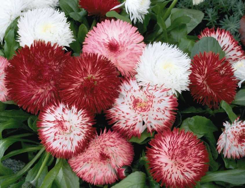 Наиболее распространены крупноцветковые сорта маргариток: Снежный шар, Красный великан (язычковые цветки красные, многорядные), Розовая махровая и другие. Снежный шар очень красивый сорт с махровыми цветками, они у него чистые белые, многорядные.