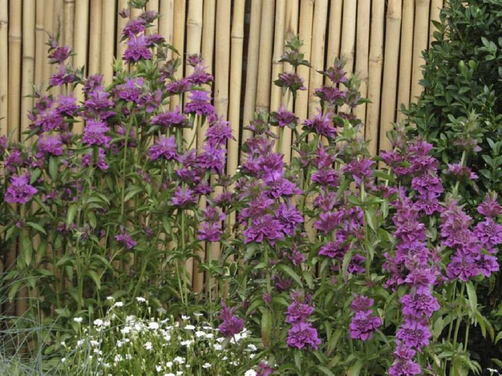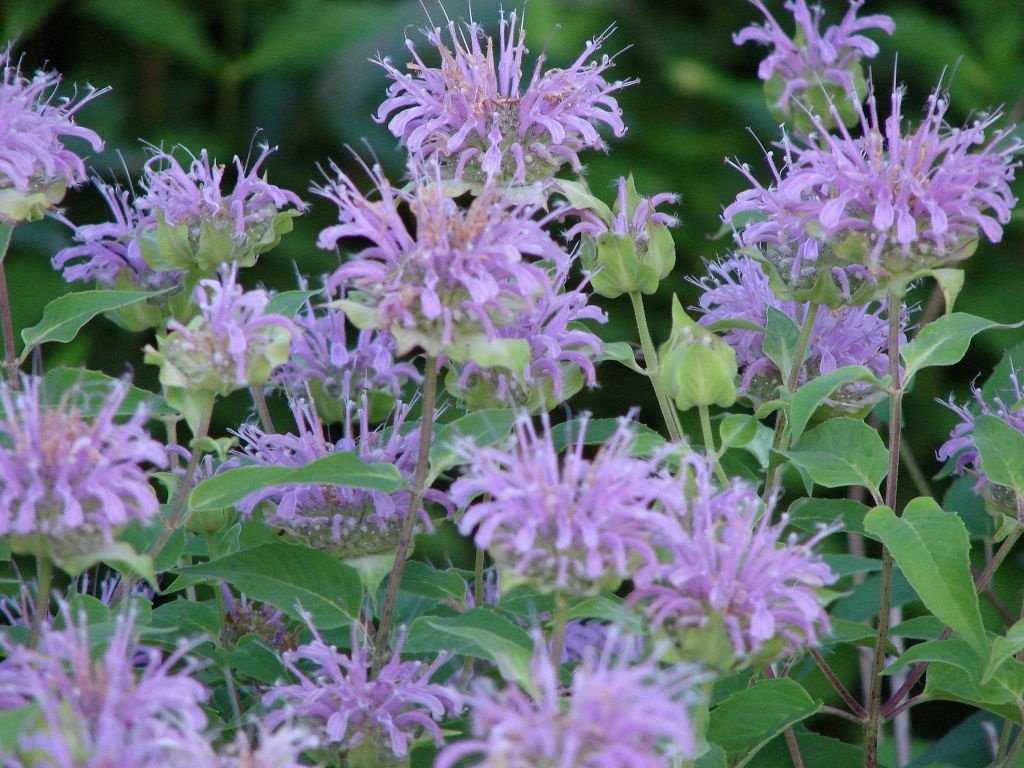 Монарда дудчатая (трубчатая). Многолетник с мочковатой корневой системой отращивает разветвленные стебли длиной до 110 см. С июля по сентябрь верхушки украшены головчатыми соцветиями до 5 см в диаметре. Лепестки окрашены в белый или бордовый цвет. Цветы источают приятный пряно-цитрусовый запах. Вид является отличным медоносом и используется как лекарственное и пряное растение.