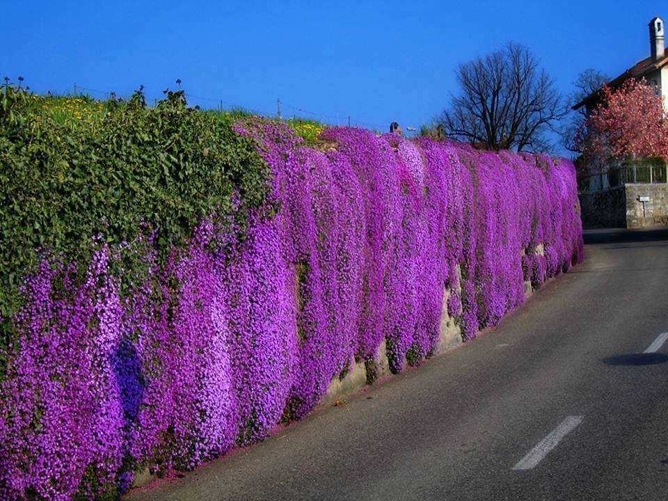 Эффектные композиции помогут создать выразительные флоксы (шиловидный и канадский), а также карликовые бородатые ирисы и нежные колокольчики. Дольше всего будут цвести сорта аубреции с лепестками синих оттенков, красно-розовые, к сожалению, отцветают намного быстрее.