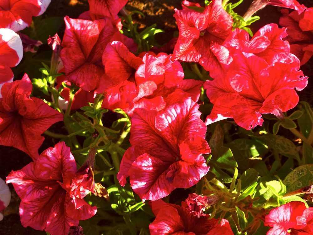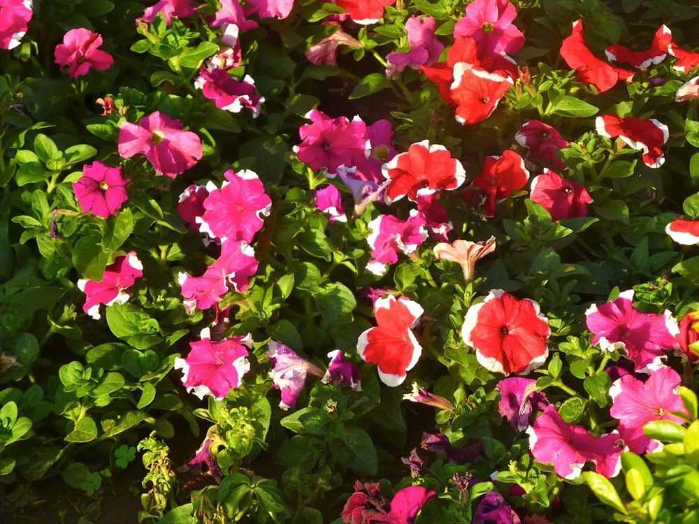 Петунии многоцветковые (Petunia Multiflora) — имеют огромное количество цветков до 5 см в диаметре. Неприхотливые, хорошо растут на солнечных местах на любой садовой почве. Они долго и пышно цветут, а дожди и похолодания им не страшны. Конечно, отдельные цветки у них не столь красивы и изысканны, как у крупноцветковых петуний, но когда они полностью покрывают куст, от них просто нельзя оторвать взгляда. Кроме того, современные гибриды идеально ровные по высоте и, благодаря этому, они смотрятся еще лучше. Чаще всего многоцветковую петунию используют в ковровых цветниках, для оформления больших клумб и массивов, особенно в городах. Из нее получаются прекрасные бордюры и рабатки.