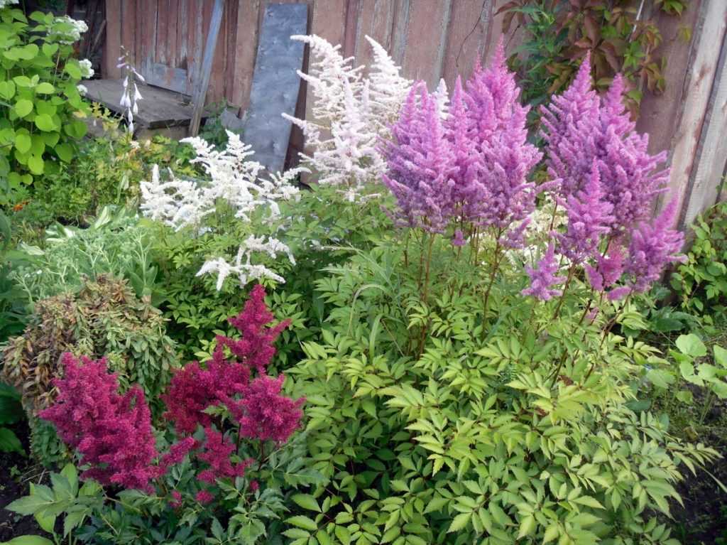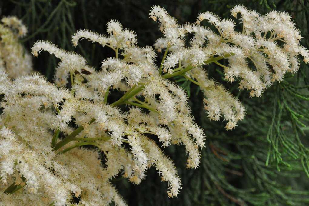 Цветение начинается в июле и длится немногим менее месяца. В этот период над густой зеленью распускаются сложные метельчатые соцветия, которые состоят из множества мелких цветов. Лепестки могут окрашиваться в розовый, белый, бежевый или зеленоватый оттенок. Цветы источают тонкий, приятный аромат. После увядания цветов листва с еще большей активностью пускается в рост.