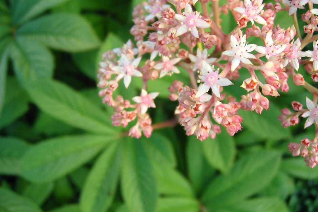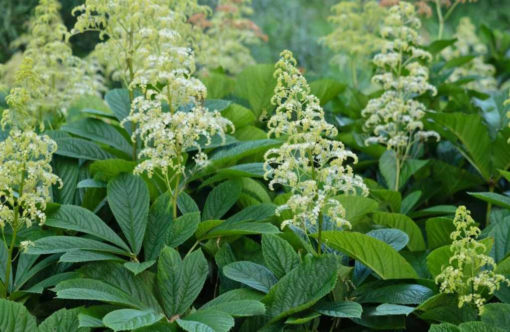 - Роджерсию бузинолистную. Встречается она в хвойных лесах Китая. Представители данного сорта вырастают до 120 см высотой. Свое название сорт получил благодаря схожести листьев с бузиной. Цветы имеют кремовый оттенок и собраны в небольшие метелки. Период цветения у растения начинается в июле.