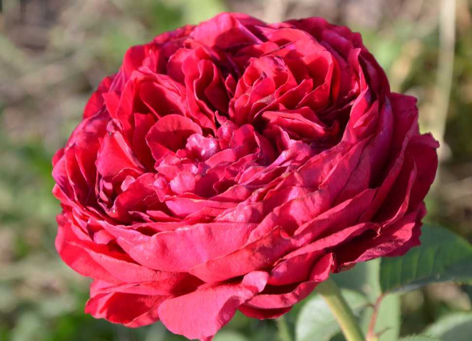 Корневище у куста очень мощное и разветвленное, уходит глубоко в почву (от 2 до 3 м). Цветки крупные, чашевидной формы, диаметром до 12 см, темно–малинового окраса. На одном побеге за сезон может появляться до 45 штук. Бутоны менее насыщенного пурпурного цвета, но по мере распускания приобретают более яркий оттенок. Густомахровые цветы настолько пышные, что середина не видна. Аромат у цветов легкий и ненавязчивый, напоминает запах розового масла, но распространяется на расстояние до полутора метров.