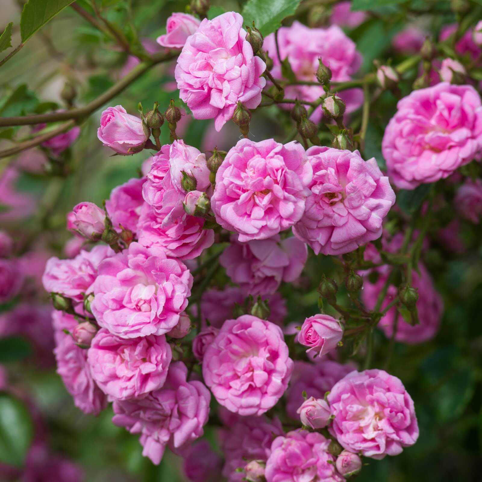 Многолетний плетистый кустарник Дороти Перкинс усыпан большим количеством ярких розовых цветов. Бутоны мелкие, но пушистые, густомахровые. В одном цвете насчитывается до 90 тонких, волнистых лепестков.