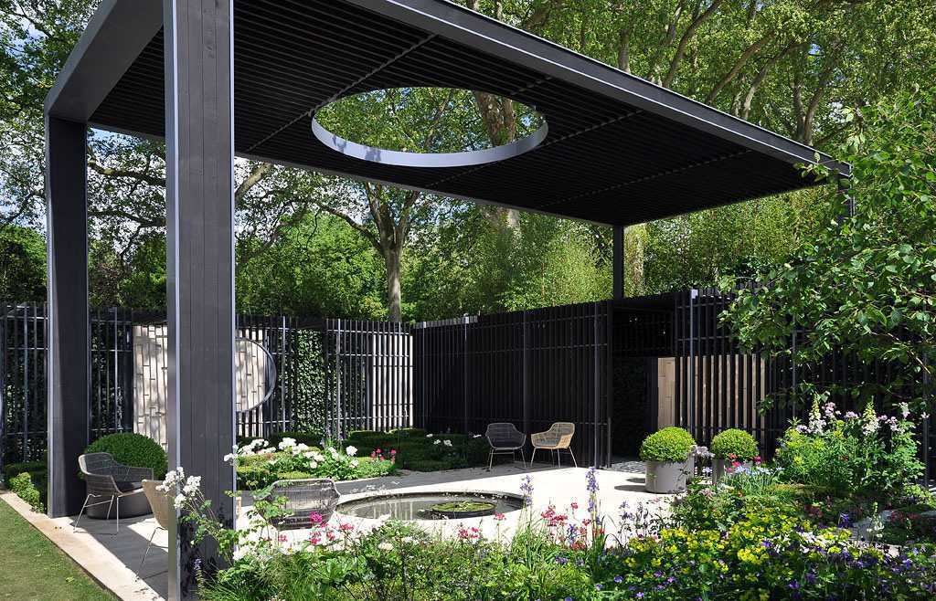 Необычная беседка: крыша с отверстием освещает небольшой прудик. По желанию передвинуть кресла можно в тень или на солнце