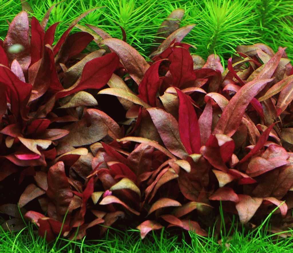 Еще одна разновидность альтернантеры с красными или пурпурными листьями и длинными (до 20 см) побегами станет украшением любого аквариума. Гидрофит растет медленно, но при оптимальных параметрах водной среды и достаточном уровне освещенности долго цветет.