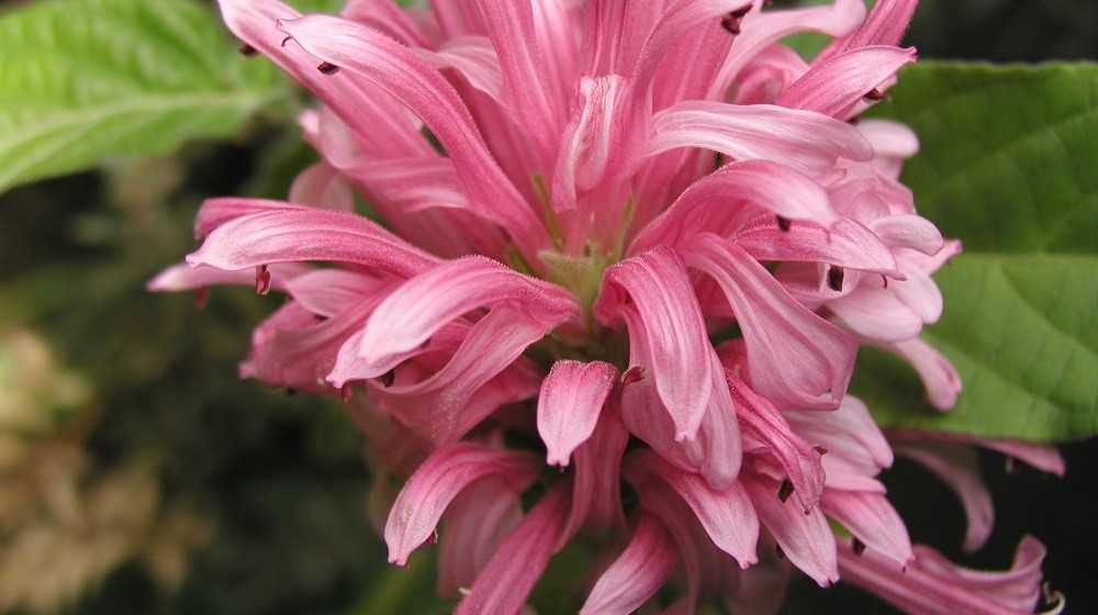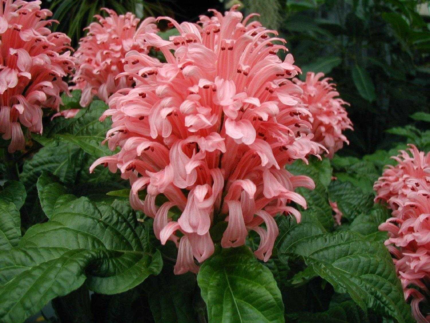 Якобиния розовая или Поля (jacobinia pohliana). Обильно облиственный кустарник, густой и мощный. Листья крупные глянцевые, отливают пурпуром. Держатся на длинных, до 8 см, черешках. Пышные верхушечные соцветия ярко-розовые.