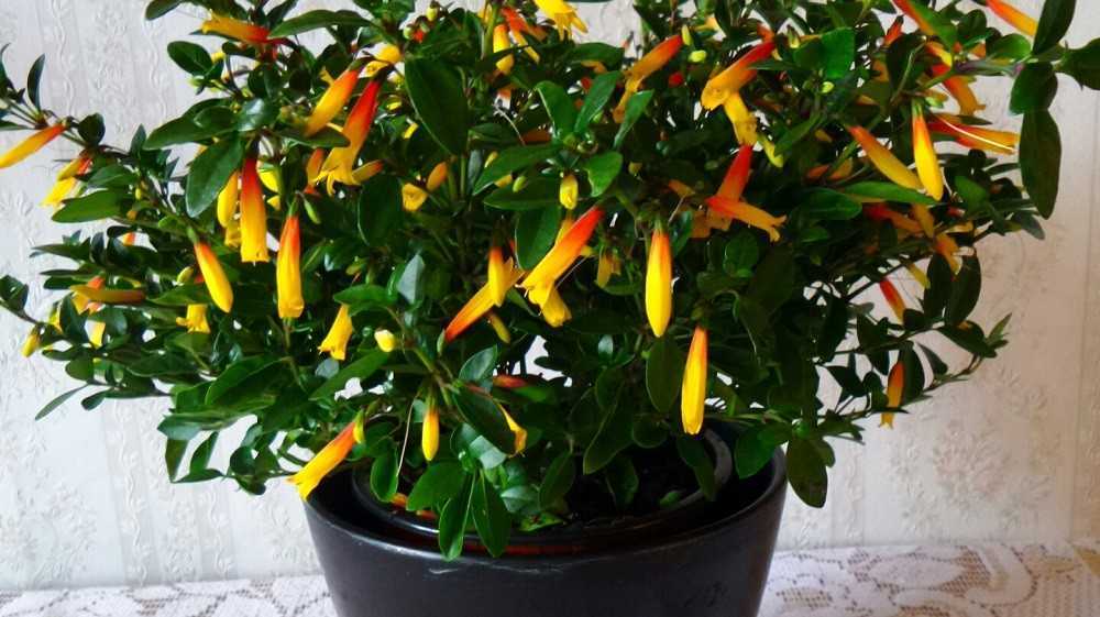 Якобиния малоцветковая (Jacobinia pauciflora). Представляет собой невысокий компактный кустик, максимальная высота – 50 см. Стебли сильно ветвятся, листочки мелкие овальные. Цветение обильное, в конце зимы. Длинные трубчатые цветки имеют красивую окраску: у основания оранжево-красные, а верхушки желтого цвета.