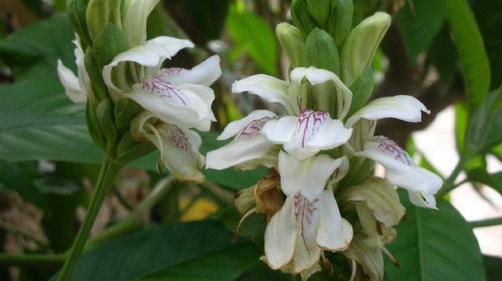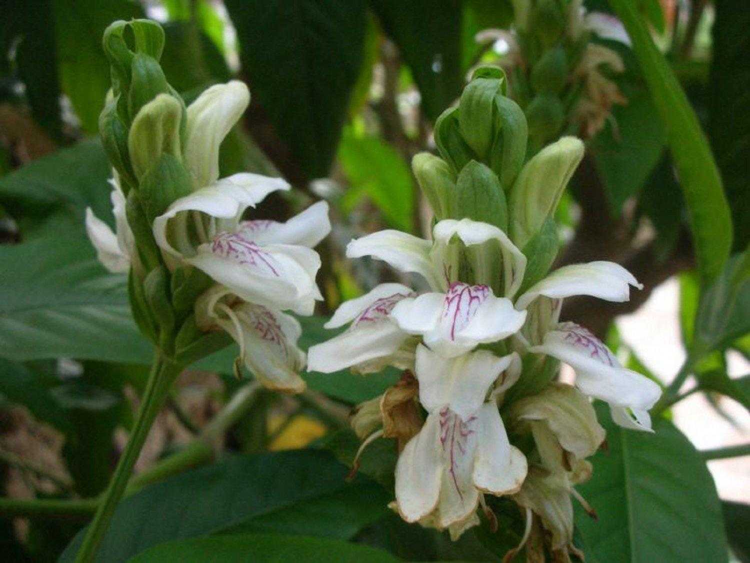 Якобиния сосудистая или Джустика Адатода (Justicia adhatoda). Кустарник вечнозеленый, с изумрудными листочками и нежными двугубыми цветками. Крупные бутоны собраны в колосовидные соцветия, лепестки белые с крапинами розового или пурпурного оттенка.