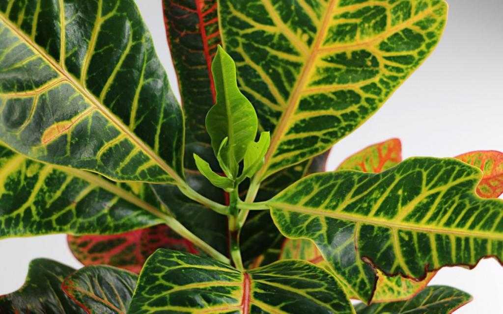 Молодые листья кротона окрашены в светлые желтовато-зеленые оттенки. Но со временем они приобретают яркую окраску и могут быть как темно-зелеными, так и красно-бордовыми. Причем независимо от сорта, на листьях присутствуют яркие прожилки или пятна.