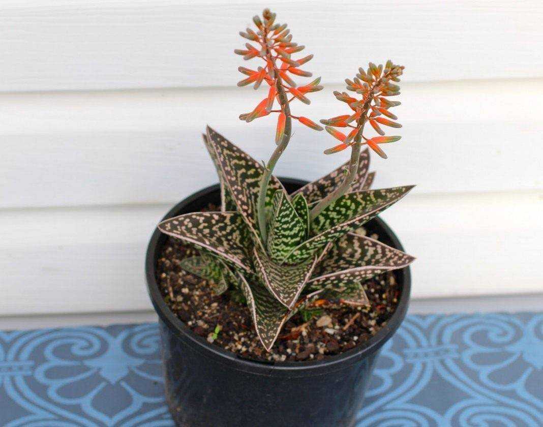 - алое тигровое, или пестрое — красивое декоративное растение, невысокое, с коротким стеблем, может цвести;