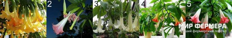 Рисунок 2. Основные виды кустарника: 1 — золотистая, 2 — ароматная, 3 — белоснежная, 4 — кровавая, 5 — пестрая бругмансия