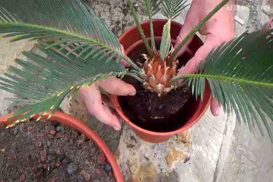 Молодые экземпляры саговой пальмы (в первые пять лет жизни) следует пересаживать каждый год. Взрослые растения достаточно крупные, проводить процедуру очень тяжело, поэтому делают это лишь в крайнем случае, когда саговнику становится очень тесно в горшке. В основном для взрослых экземпляров достаточно заменить верхний слой земли на свежий субстрат.