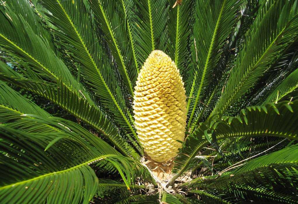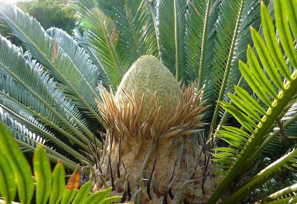 Цикас не является цветковым растением и не цветет в привычном для нас понимании. Он относится к двудомным – с мужскими и женскими экземплярами. У мужских растений на верхушке образуется стробила (каудекс), напоминающая шишку. У женских экземпляров она напоминает пучок колосьев, где формируются мегаспорангии. По мере развития в них появляются крупные семена. Но такое явления в комнатных условиях бывает крайне редко и наблюдается у деревьев старше 15 лет.