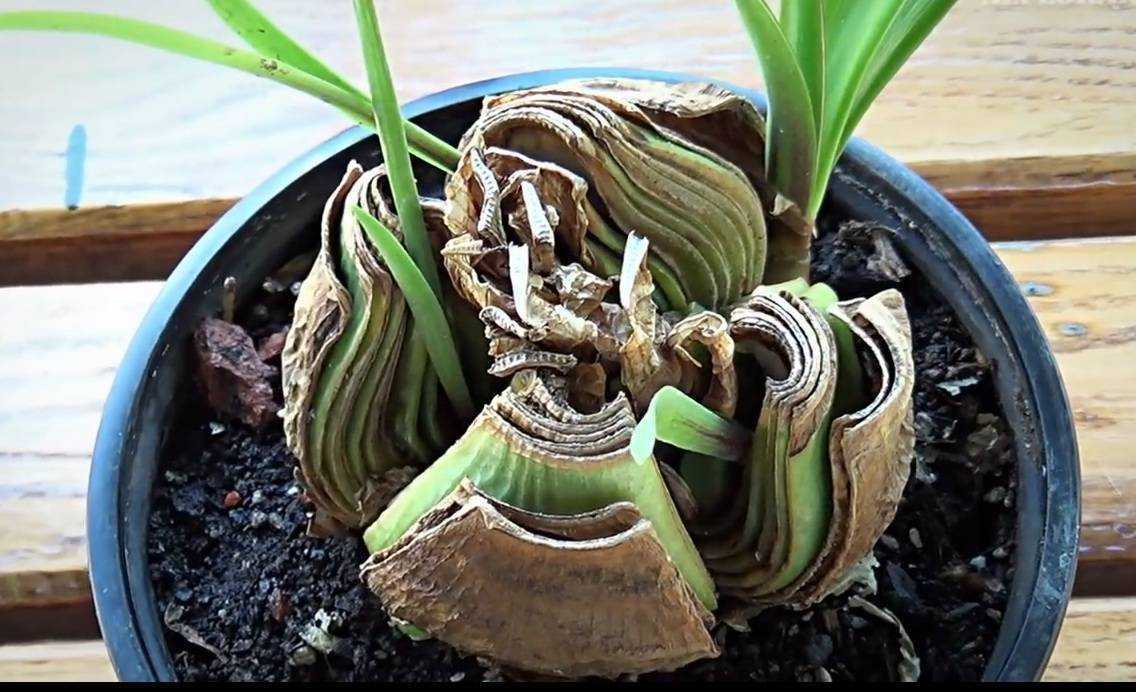 - Засохшие листья убирают. Но принудительно обрезать всю «корону» не стоит — питательные вещества из листьев перейдут в луковицу.
