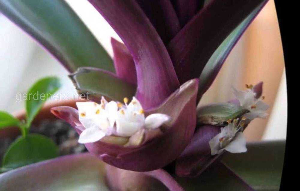 Рео очень неприхотлив в уходе — в этом его можно сравнить с кактусом. Ведь что для него нужно? Полив и комфортные условия содержания. Если всё будет нравиться, то он еще и зацветёт. Вот так же и с Рео. Несмотря не свои большие и красочные листья, он ещё умеет цвести. Правда цветы очень маленькие, белые, и будто спрятаны от глаз в небольшой «лодочке».