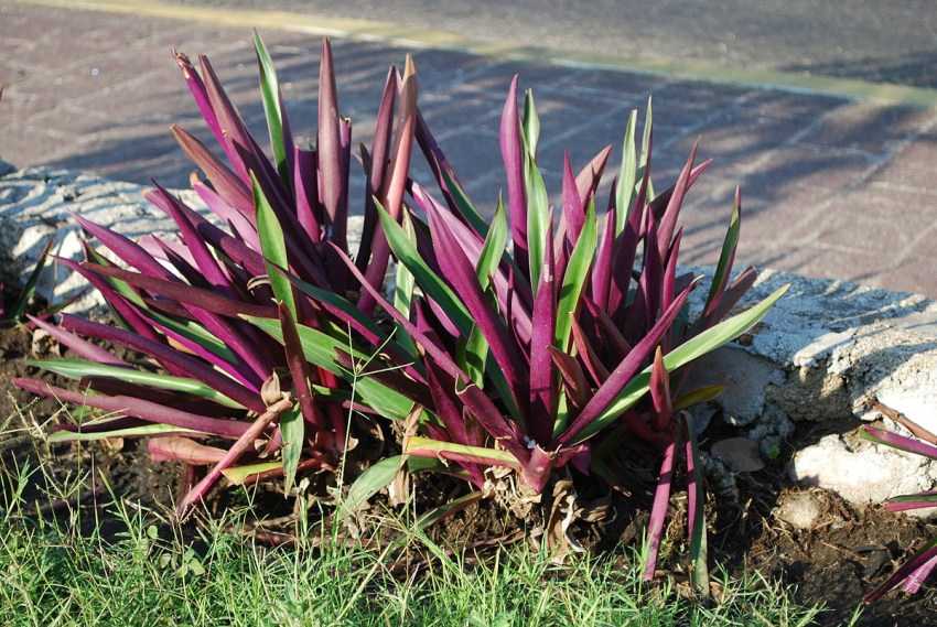 - имеет длинные мечевидные листья, окрашенные с внешней стороны в зеленовато-оливковый цвет, а с внутренней фиолетовый оттенок;