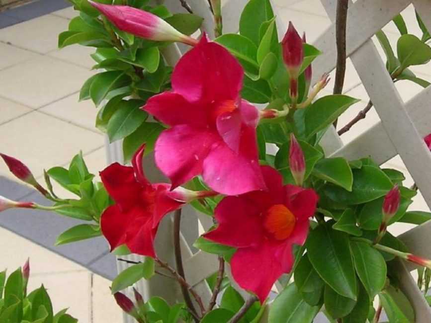 Обратите внимание, что для нормального отращивания новых побегов мандевилле нужны вертикальные и горизонтальные опоры, по которым она сможет виться. Предусмотреть такую конструкцию необходимо заранее