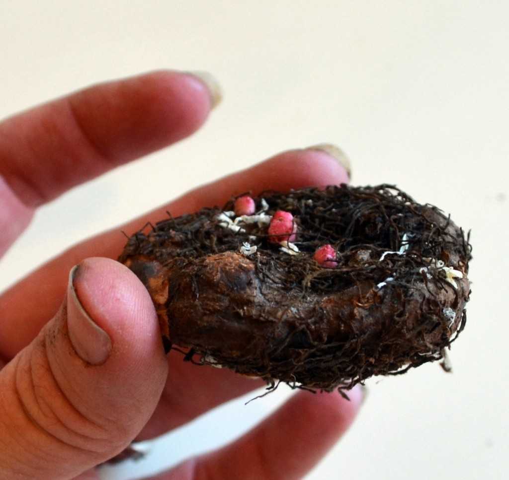 После этого оставшуюся землю необходимо удалить, а клубни переложить сухим мхом или опилками и перенести на хранение в сухой погреб.