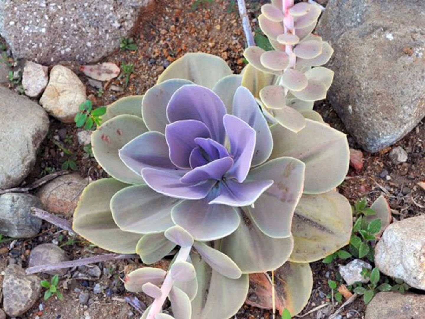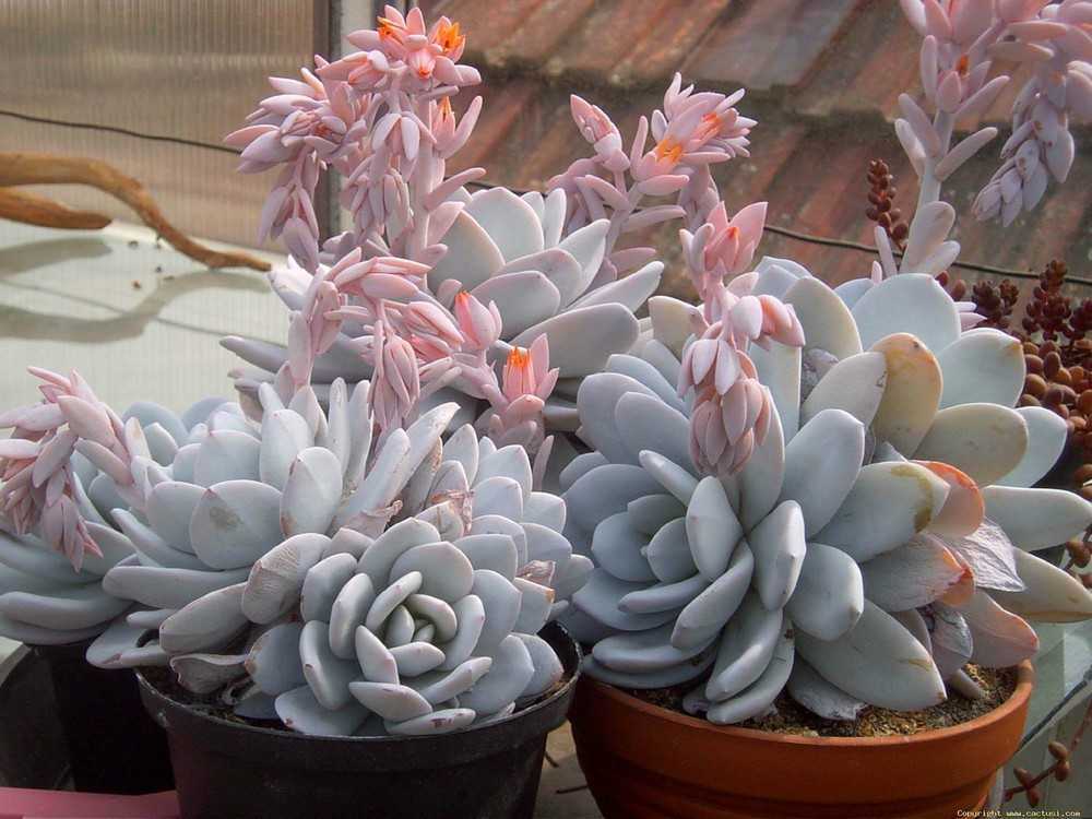 Очень нежный кустик с голубовато — серыми, округлыми листочками. Оттенок листьев образует голубой восковой налет, который легко снимается при малейшем прикосновении. Цветоносы крепкие, толстые, немного изогнутые на вершине. Цветки светло — розовые с голубоватыми прицветниками. Листовые розетки данного вида напоминают по форме цветки розы.