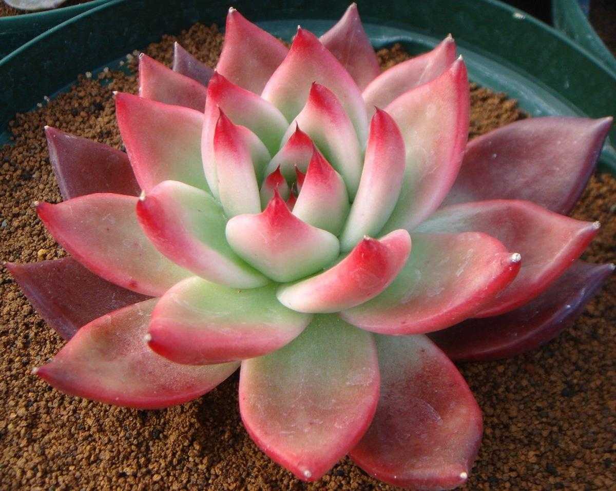 Только что купленный суккулент требует неотложной пересадки. Дело в том, что грунт для продажи не рассчитан на долгое сохранение нормальной жизнедеятельности эхеверии. В дальнейшем пересадка осуществляется раз в 2-3 года. Эхеверии выращиваются в универсальном грунте для суккулентов. Чтобы самостоятельно изготовить почву, возьмите в равных пропорциях крупный песок, листовую и дерновую землю, добавьте битый кирпич. Емкость — невысокая, керамическая, с дренажными отверстиями.