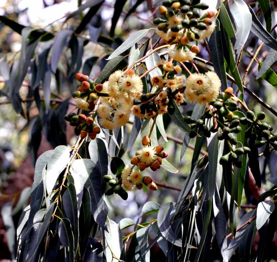 Эвкалипт шаровидный (Eucalyptus globulus) формирует плотную крону дерева со слегка длиной, узкой листвой. Цветение в конце лета и осенью.