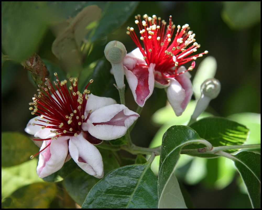 Время цветения фейхоа – июнь. На побегах текущего года в пазухах листьев образуются цветки, одиночные или в небольших соцветиях. Цветки на длинных цветоножках, четырехлепестковые. Лепестки овальные, гладкие, внутри пурпурно-розовые, снаружи белые. Длинные многочисленные розовые тычинки увенчаны золотистыми пыльниками. Цветет фейхоа около трех недель.