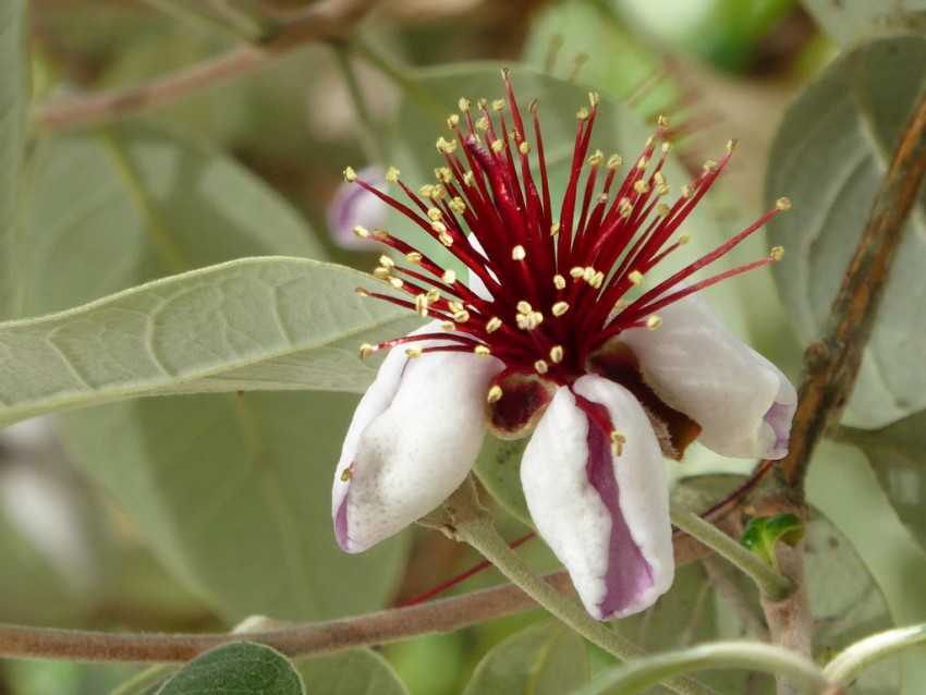 Почему многие садоводы предпочитают выращивать фейхоа в открытом грунте в саду? Потому что растение это красиво цветет. Сверху цветы растения белые, а внутри малиновые. Особенно выделяются длинные тычинки. В открытом грунте цветение растения наблюдается весь июнь.