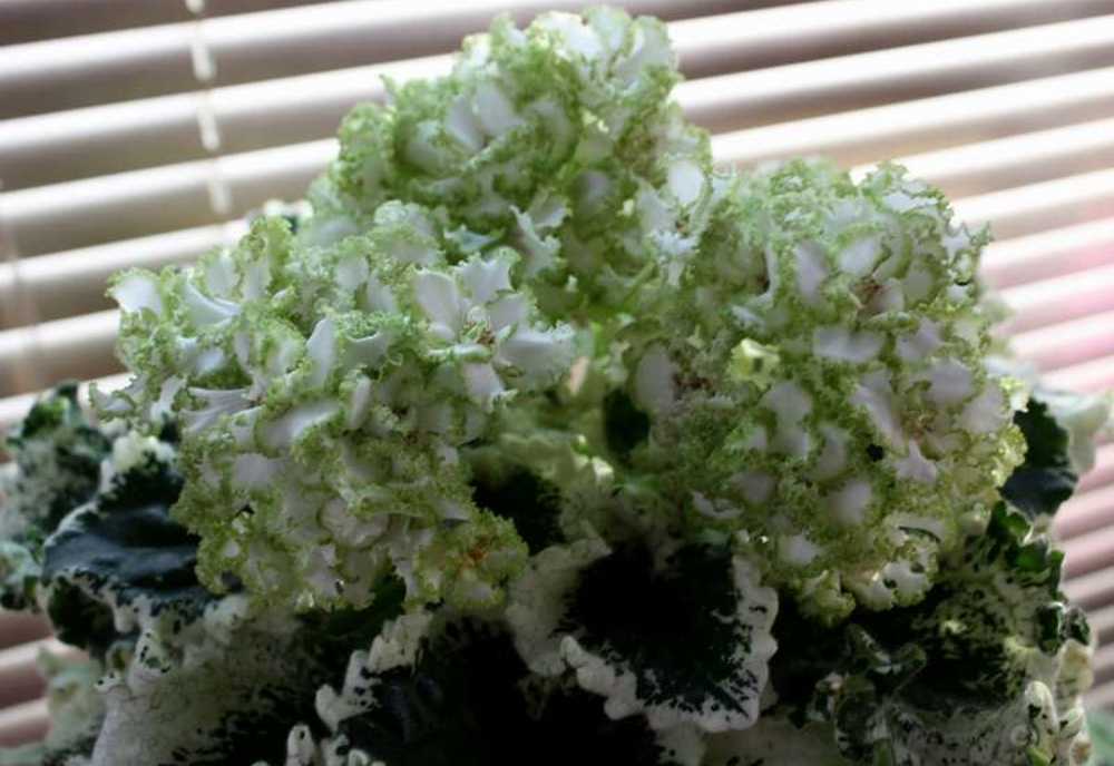 Цветущая фиалка этого сорта очень гармонична. Ажурный букетик, сливочно-белый, украшенный зеленоватой, бронзовой или розовой каёмкой почти сливается с тёмной зеленью пёстрых листьев.