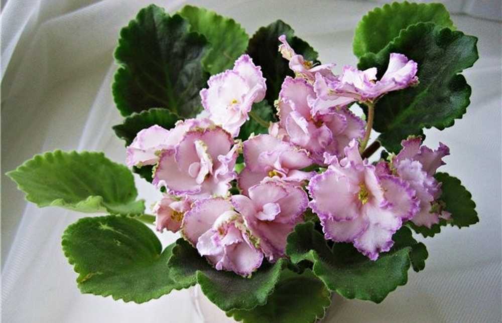 Цветы у этого растения белой расцветки, крупного размера, махровые, кружевные. Край лепестка имеет тонкую розово-малиновую гофрированную кайму. Розетка светлая, небольшая. Листва слегка волнистая.